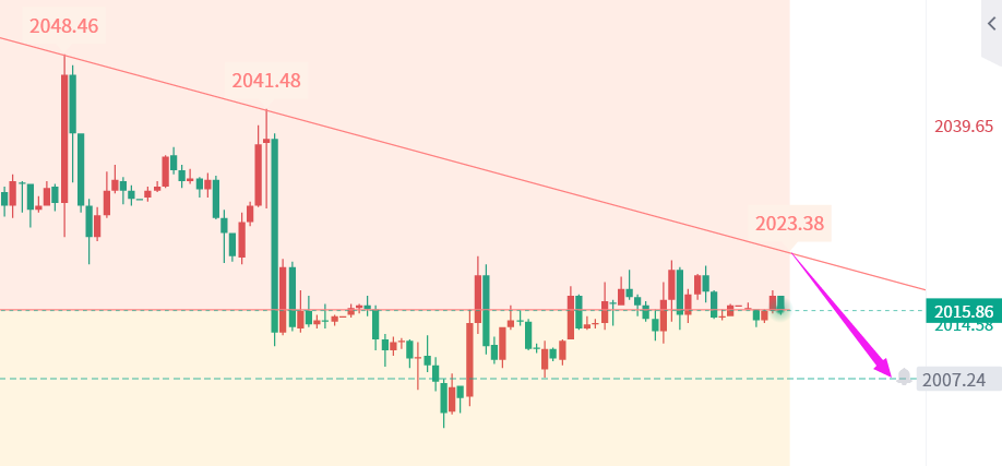 黄金昨天一天的波幅不大,上方压力明显但是下方空间也未有效打开,目前总体的交投位置在2015附近上下8个点震荡。今日开盘走势延续了周一的盘整,操作上还是按照2025-2005区间高空低多对待,早盘若是行情触及2025可空,去看2007周一的低点目标位,若是欧盘开盘行情无法到2025,那就2020直接空,目标2007不变。