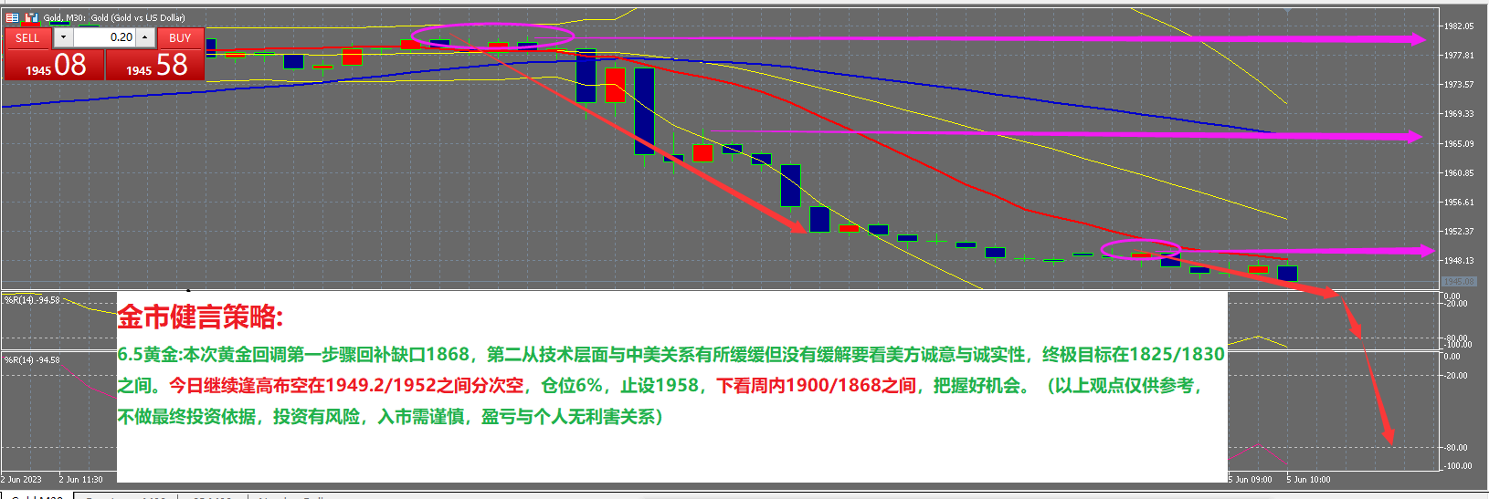 6.5黄金:本次黄金回调第一步骤回补缺口1868,第二从技术层面与中美关系有所缓缓但没有缓解要看美方诚意与诚实性,终极目标在1825/1830之间。今日继续逢高布空在1949.2/1952之间分次空,仓位6%,止设1958,下看周内1900/1868之间,把握好机会。(以上观点仅供参考,不做最终投资依据,投资有风险,入市需谨慎,盈亏与个人无利害关系)