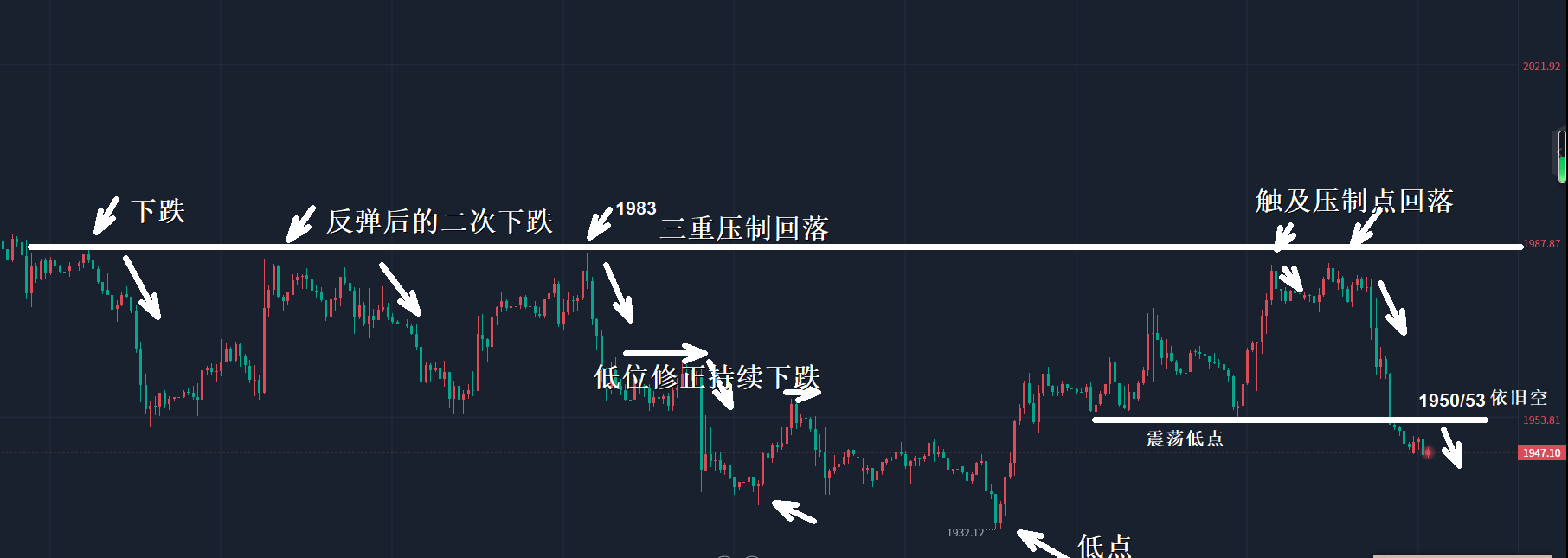 反弹亦然是空,高位承压之后持续下跌,此次反弹上行触及前期的压制点1983一线,前期多次触及均未能突破走高,而此次反弹在未能下跌之前都是看好涨幅破位持续走高,而随着非农数据公布,高位呈现回落态势之后,形成了延续性下跌,短期高位的压制点成为了不可逾越的鸿沟。跌幅下探,那么后市的机会基本围绕跌幅形成持续。