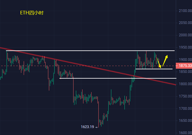 以太坊,好大哥都已经刷新高,但以太坊只完成了第一阶段的反弹,为什么说是第一阶段,自价格今年见顶2165下跌以来,整体下跌结构中有三个承压起跌点,2165-2025-1935,而1935刚好是这轮日线反转的转换位,上周首次反弹触及此位置后,币价在短短几个交易日多次承压,日线也进入阴阳交替循环的震荡调整模式,并且在反弹收阳的交易日当中,价格都是冲高1935一线明显回落并报收上影阳线,所以可以看出当前日线想要步入下一个上涨阶段,突破企稳1935是前提且必备的条件,短期震荡区间锁定1860-1935,关键支撑看1830,如果是继续保持箱体震荡,那么日内回踩箱体底部1860先多即可。