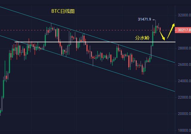比特币,连续的冲高之后,近几日显然多头势能开始放缓,币价也开始进入调整阶段,虽然上周五比特币依然强势刷新年内新高至31500附近,但是冲高回落之后日线连阴回调;在上周文中小冯就强调过,日线的这轮反弹阻力在31000关口,而且如果需要调整的话,调整位置也会在此位置,上周五虽突破,但突破没有企稳,不企稳就无法继续有效打开上方空间,所以短期我们将继续看调整,在调整中只要日线不出现大阴连续回撤的话,继续看二次反弹破高,至于如何判断价格是否进入大阴回撤反转,参考上一次冲高31000关口后的下跌即可;再看此次,回调力度不大,31000连续承压后比特币震荡式回调,短线29000将作为第一轮回调的支撑分水岭,日线回调不破此位置的话,二次看涨不变。