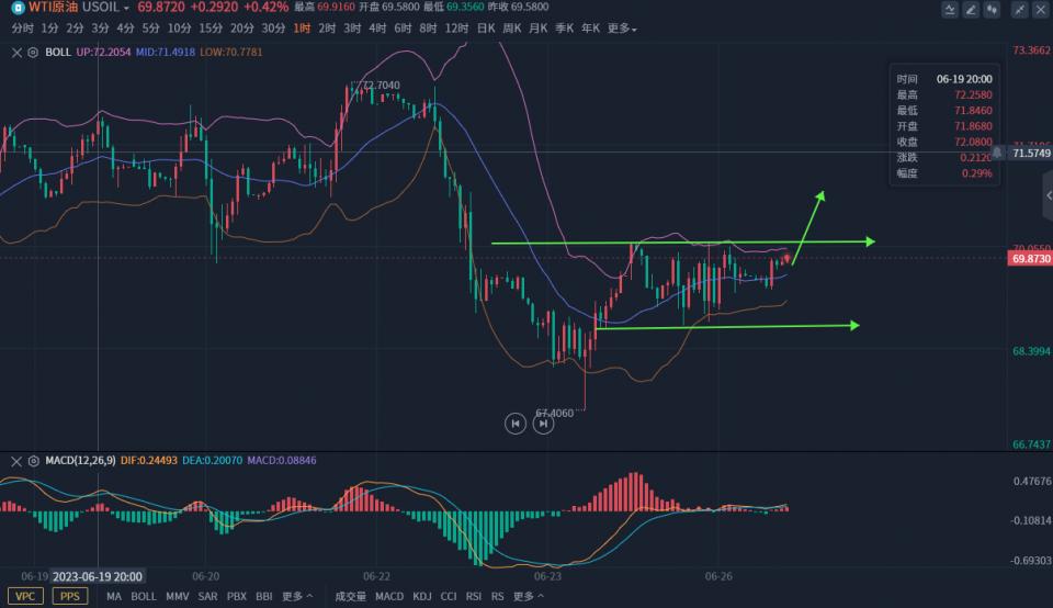 原油方面、原油在上周五晚盘快速探底,日线长下影十字星收盘,昨日早盘跳空直接突破十字星高点,打破短期弱势,所以昨日早盘回落一定要多一次,但是昨日上升幅度有限,美盘和凌晨上升连续承压70附近压制,不过昨日也多次回撤企稳68.7上方,震荡上升的形态没有乱,今日可继续多。早盘小时线大阳上升形成吞没形态,如果今日看多一定需要直接去多,等待回落去参与反而容易转换成震荡方向就不明朗,可以69.7直接小多博弈70突破。