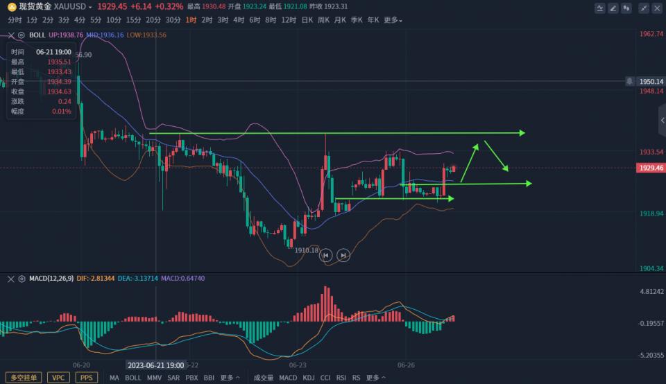 下方支撑1927和25,回踩的位置也很重要,早盘上升回踩低点1927,如果午后直接1927企稳,短线延续上升的力度就越大,大概率会直接突破昨日高点去测试1937附近压制。如果回踩到1925依然可以继续多,只是回踩幅度越大,上升的力度相对会减弱。由于整体趋势震荡下跌偏弱,同样欧盘也非常关键,如果欧盘出现长时间承压不破早盘高点,同样需要防止形态再次转弱,下方关键分水岭就是早盘小时线大阳线底端,形态反抽调整一定不能破低,破低转弱多单需要调仓,思路上就需要反抽空了。近几天回落都出现在美盘,上方关注1937.5附近双顶压制,这也是趋势关键压制触及依然可以空。
