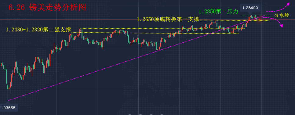 镑美:镑美昨日给的是1.2650-1.2850的区间处理;但是实际日内震荡的区间还要小;因此,空仓为主;目前盘面上,顶底转换的区间不变,依旧是1.2650-1.2850的区间。这个区间之中,选择低吸高抛处理;