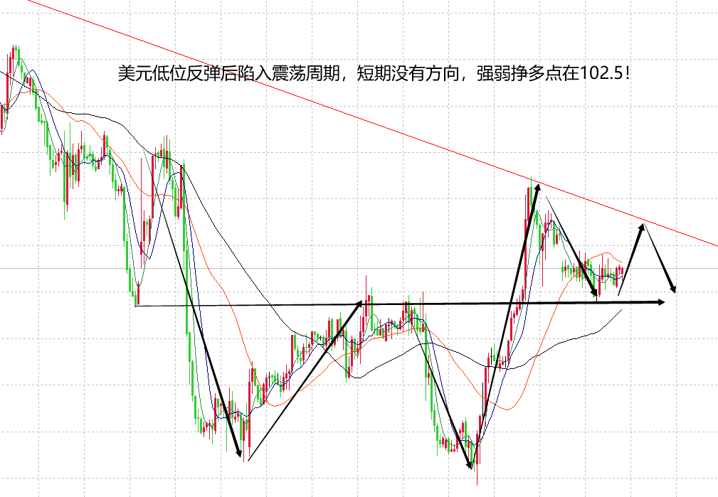美元横盘一天,一直维持在102.4附近震荡,几乎没有任何改变,亚欧美三盘也未出现实质性的形态变化,市场消息面也缺乏刺激,因此,美元基本要维持周评,周一的看法不变。美元在102.5附近属于震荡周期中的中间点位,具体表现为没有方向,没有强弱,上涨可见104.5,下跌可见100.5,因此,涨跌都有空间,具体看市场影响。周内在102.5之下属于震荡偏弱下跌,在102.5之上属于震荡偏强上涨,目前处于102.5点位,就是强弱争夺的关键点,因此,暂时无法通过美元的走势来判断黄金的强弱。