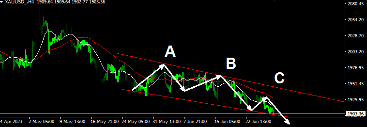 黄金四小时线继续保持大阴线击穿的态势,k线直接贴着均线下行,均线保持向下的态势,目前没有掉头的可能,强行延续向下,两条均线也是如期的死叉,眉头反转的可能,空,1910空