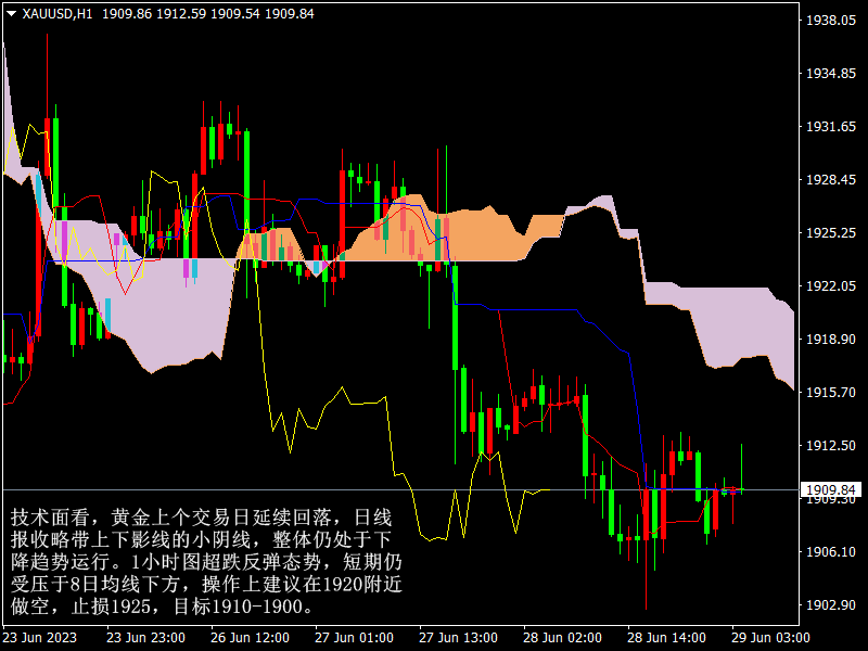 美元指数昨日上涨,此前包括美联储主席鲍威尔在内的一众全球央行领导人做出发言,鲍威尔称不排除美联储在7月的下次会议上再次加息的可能性,金价触及近四个月来最低,受累于对利率将在更长时间内保持高位的押注。技术面看,黄金上个交易日延续回落,日线报收略带上下影线的小阴线,整体仍处于下降趋势运行。1小时图超跌反弹态势,短期仍受压于8日均线下方,操作上建议在1920附近做空,止损1925,目标1910-1900。