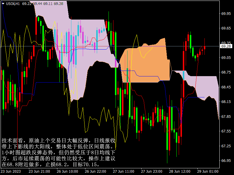 油价昨日攀升约2%,此前报告显示美国原油库存连续第二周下降,且降幅大于预期,盖过了进一步加息可能减缓经济增长并令全球石油需求减少的担忧。今日重点关注美国截至6月24日当周初请失业金人数、美国第一季度实际GDP年化季率终值、美联储官员讲话。技术面看,原油上个交易日大幅反弹,日线报收带上下影线的大阳线,整体处于低位区间震荡。1小时图超跌反弹态势,但仍然受压于8日均线下方,后市延续震荡的可能性比较大,操作上建议在68.8附近做多,止损68.2,目标70.15。