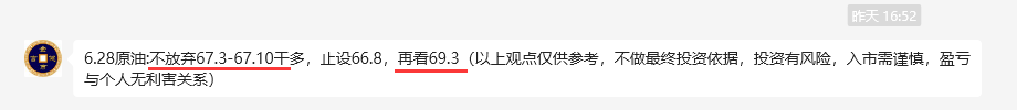 6.28原油:不放弃67.3-67.10干多,止设66.8,再看69.3(以上观点仅供参考,不做最终投资依据,投资有风险,入市需谨慎,盈亏与个人无利害关系)