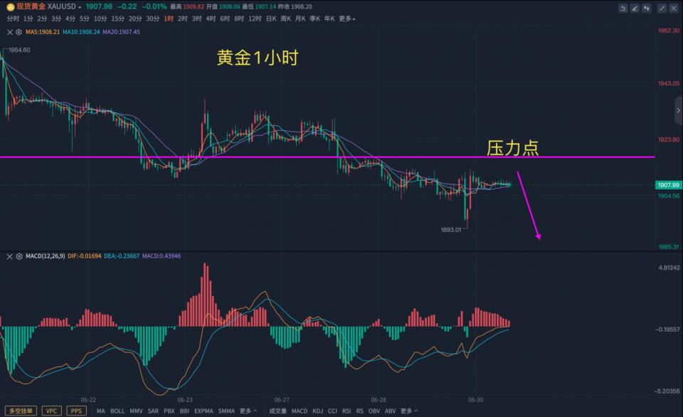 另外,美国至6月24日当周初请失业金人数公布为23.9万,预期值26.5万,前值26.4万,金价借势下跌到1892美元/盎司的位置,如果昨天看过博文的朋友,非常清楚1910空单的目标区域,刚才就是美盘打到的最低点附近,尾盘看着强势反扑,但整体弱势的局面并没有改变。