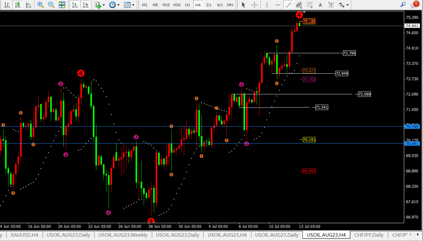 因为日线蜡烛图已经是偏离均线,所以短期参与多单是没有机会,而我们就必须去找点位进行空。从前期的走势看:目前上方压制在75.6-76一线。