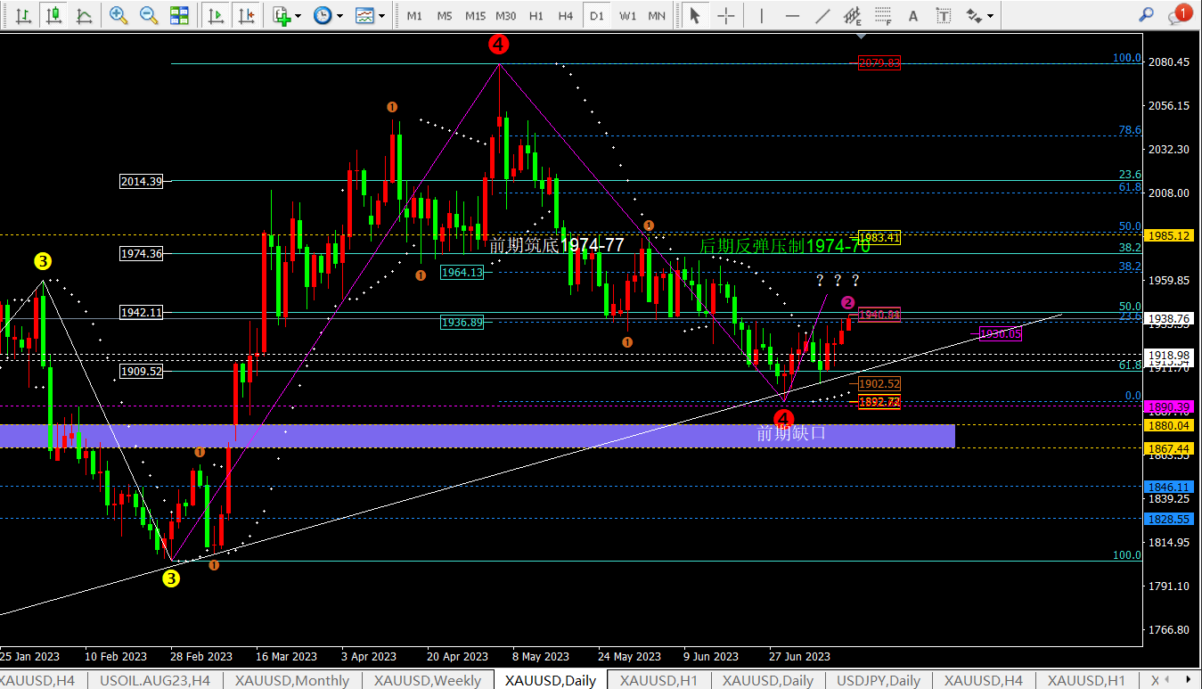 短期下方关注点是中轨和均线MA5以及MA10粘合支撑1926-27和1922一线;当然如果目前等1926-27去参与多单肯定是没有机会;因此目前只能高位去参与空单。而目前上轨压制在1956.5一线,其次是均线MA60附近1964一线。