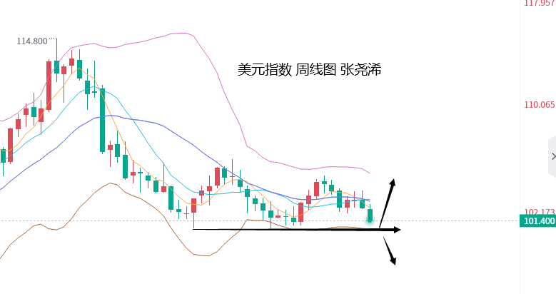 整体来看,美元指数日图走势连续回落,带动布林带向下扩散,短期均线维持死叉,附图指标也保持空头信号,暗示短期走势仍偏回落为主,但周图走势则接近今年以来的强劲低点支撑100.82,触及或有再度止跌连续回升的需求,如再度止跌,则会令金价遇阻回落,去回补3月份缺口,如跌破支撑,则暗示后市还有较大的回落空间,并会令金价反弹回升触及2000美元关口附近;
