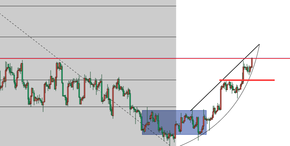 要么就是2008,要么就是1995,首先我解释一下,2008是黄金前期2080整体下跌的61.8%黄金分割位,现在50%是1986,你看86突破,那自然要把下一个交易预期和范围放在2008左右了,而1995,则是本轮上涨的曲线形态顶点,如图所示你们能看到的,上冲的顶点压力就在1995附近,当然,这里再做的话,就只能依托2008做下一段看跌尝试了。