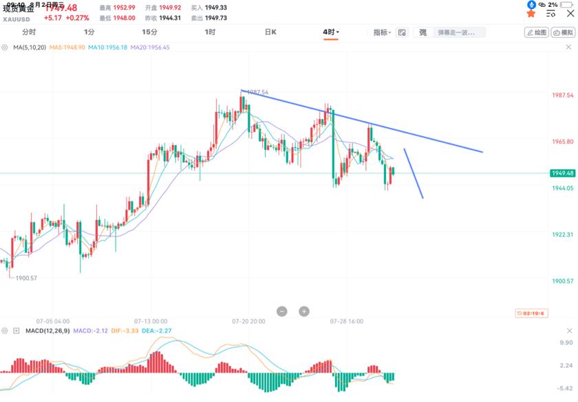如图,黄金我们看到昨天出现了一波冲高回落的行情,重新回到了1945,抄底的声音又开始了,但还是有点着急,这一波黄金自1970上方下跌,受美国有至7月29日当周红皮书商业零售数据的影响,既然空与我前面的判断一致,那现在要做的就是继续跟进空,但不要追空,这估时间黄金的下跌是以波段为主的,而不是持续的单边极弱。