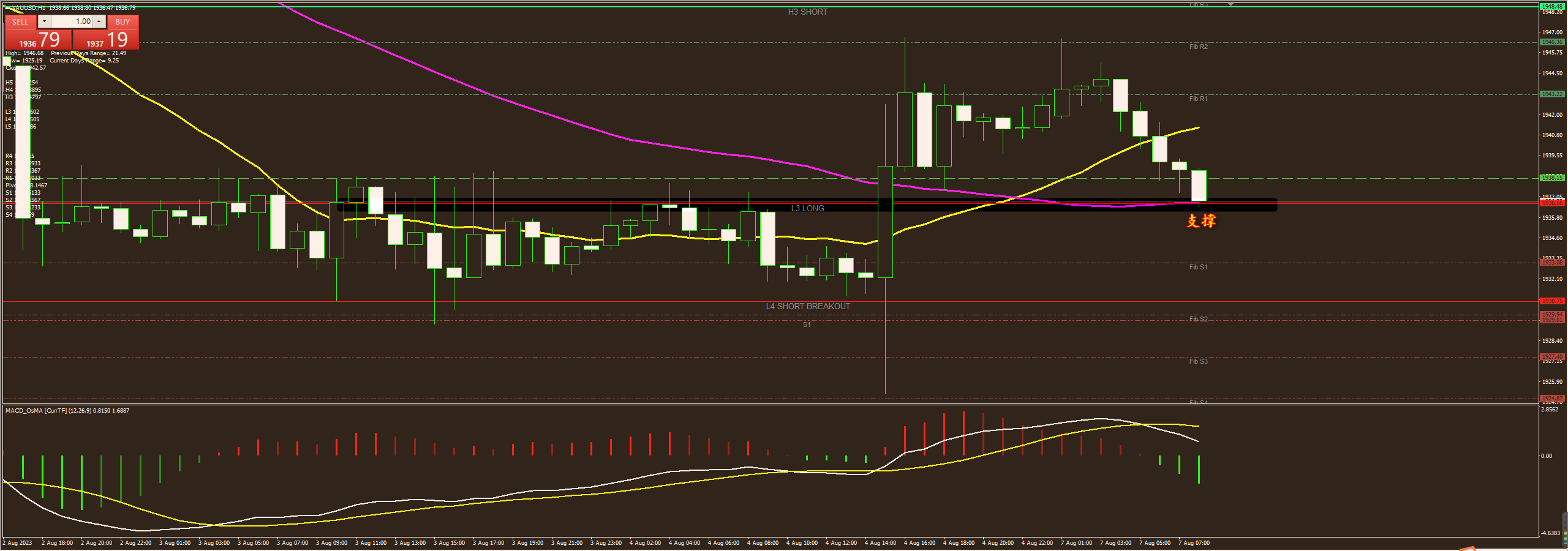 通过对黄金小时图解析得知,黄金从早盘冲高回落目前在下方的均线位置同时也是前期的反弹顶部位置,相对而言支撑力度比较强烈一点,下方附图MACD显示目前在零轴上方运行虽然有死叉迹象但是目前属于强势调整状态,短期继续窄幅震荡调整运行在操作上我们继续高空低多思路,具体建议参考早盘策略