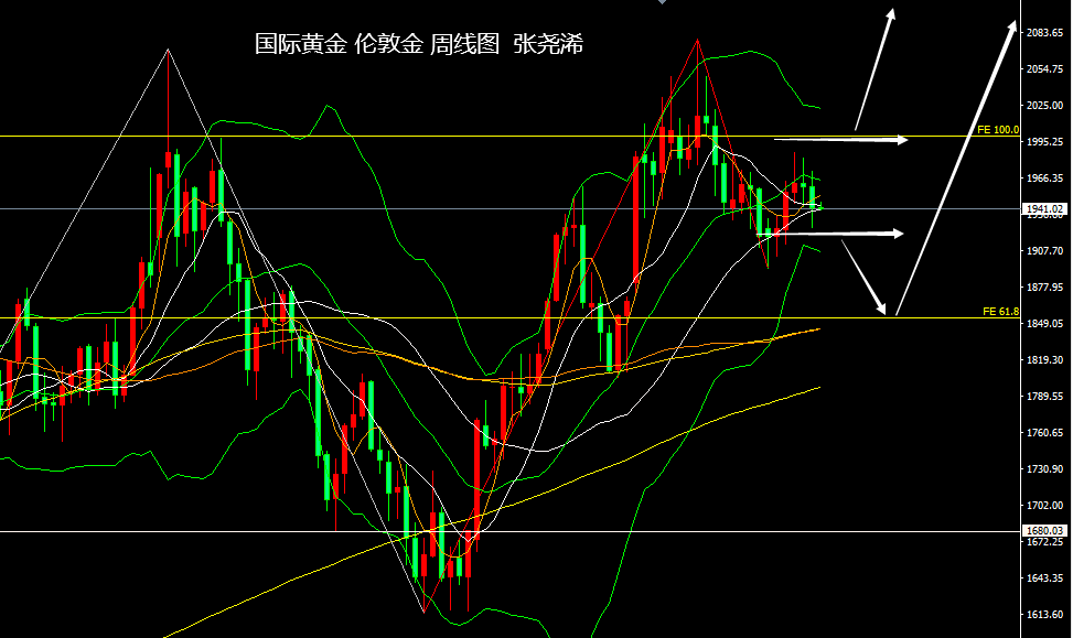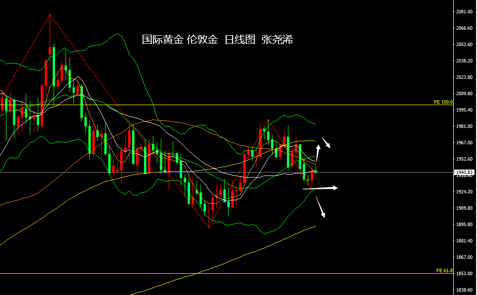周线级别:金价上周延续前两周的看空回落形态,如期走低,继续收盘至中轨线下方,但在周尾有明显回升力度,短期或继续维持区间盘整行情,下方依然还是重点关注能否稳健跌破30周均线支撑或1930美元下方,上方依然还是关注中轨线阻力以及2000美元关口能否持稳突破;向下则看跌至61.8扩展线的1852美元附近支撑博取止跌看中长线多单;向上突破,则顺势跟进等待刷新历史高点即可。