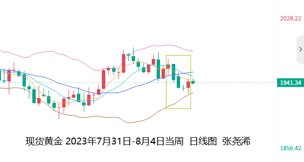 到周五时段;因失业率低于前值而打压金价迅速走低录得当周低点,但由于美国7月非农就业报告略逊于预期,以及6月份数据的向下修正,支持了美联储在9月份暂停加息的理由,则打压美元指数盘中大幅下挫,提振金价市场遭遇砸盘推动自日内低点上升20美元。但因美联储博斯蒂克,美联储可能在2024年之前一直处于紧缩领域,限制了金价反弹动力,最终有所微幅回撤收线。