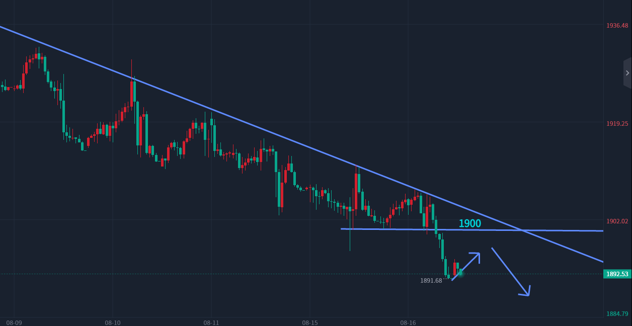 盘面价格在三次测试1900美元一线支撑后最终跌破这一支撑位置,所谓事不过三,就是如此,支撑位的支撑作用在多次测试后逐步削弱,最终跌破,那么这个位置就有支撑转换为压制,本交易日的布局也围绕这个顶低转换做入手,反弹1900附近沽空参与。早间开盘震荡在最低位位置,这和连日来的表现一致,亚盘依然是修正盘,还是老规矩,卡死时间循环,亚盘震荡休息,欧盘见高,晚间20:00前后开始回落。