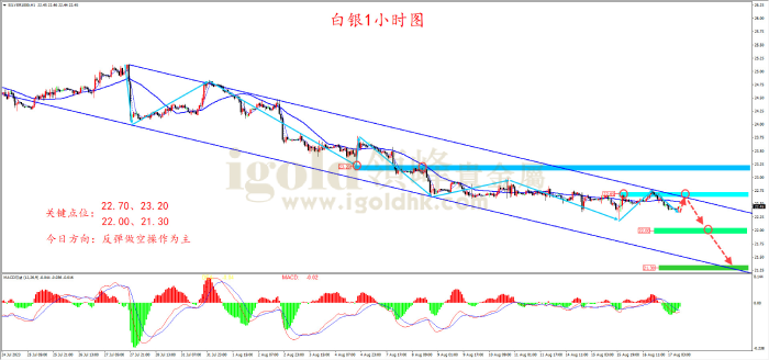 从一小时周期图的形态上看,自25.13高点承压回落以来,价格呈现高低点逐步下移的看空形态,且整体维持在下降通道内运行,表明行情仍处于空头趋势,原则上,上破22.70的通道上轨压力之前,价格向下测试21.30的通道下轨支撑的概率增大,上方22.70的通道上轨压力可以作为日内较好的空单入场点。结合MACD指标来看,DIFF线与DEA线死叉,表明行情偏空头,但考虑到空头动能柱步未能放量,日内可以等待价格反弹至22.70的通道上轨压力附近尝试空单。