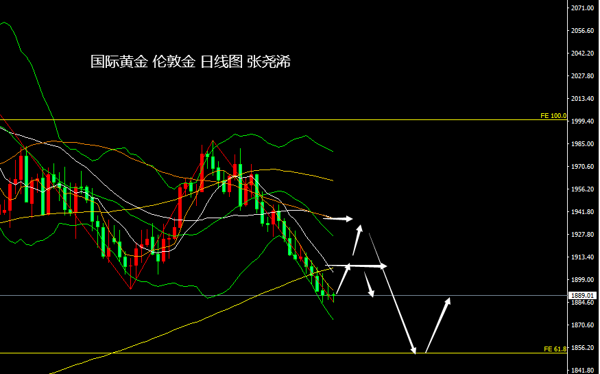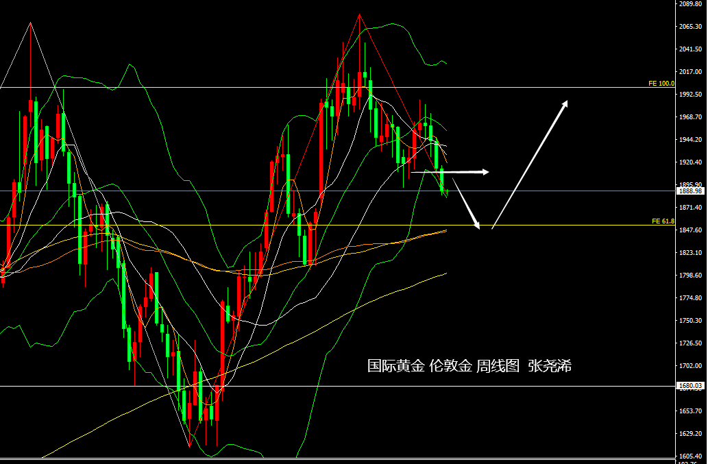 黄金市场上周:国际现货黄金/伦敦金继续走出雷同于前周的回落力度再度走低收跌,也如期触及布林带下轨,动力持稳,未见减弱迹象,暗示后市仍有望进一步回落走低,触及之前反复说到的61.8扩展线1852美元附近或者更低位置,耐心等待;