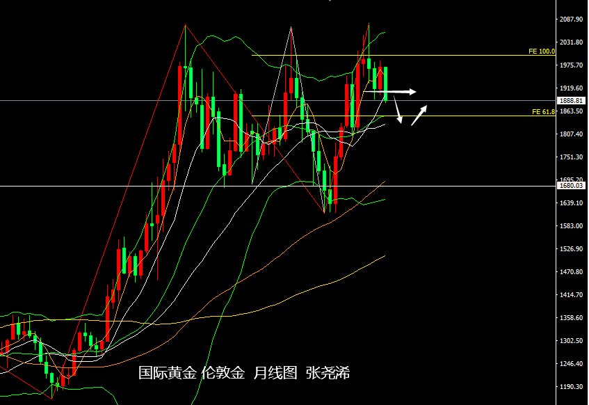 技术上:月图级别,金价目前已初步打破近几月维持在1990-1890美元的震荡区间底部支撑,以及10月均线支撑,虽然未收官月线,但从震荡的区间处于历史高点2078美元附近遇阻回落的强压趋势之中,再加上附图指标KDJ转死叉向下,MACD动能柱持续缩减,和目前的走低力度来看,后市将偏向进一步延续回落走低,上方将以5-10月均线为阻力进行高空;并有望触及布林带中轨及30月均线支撑附近的目标;