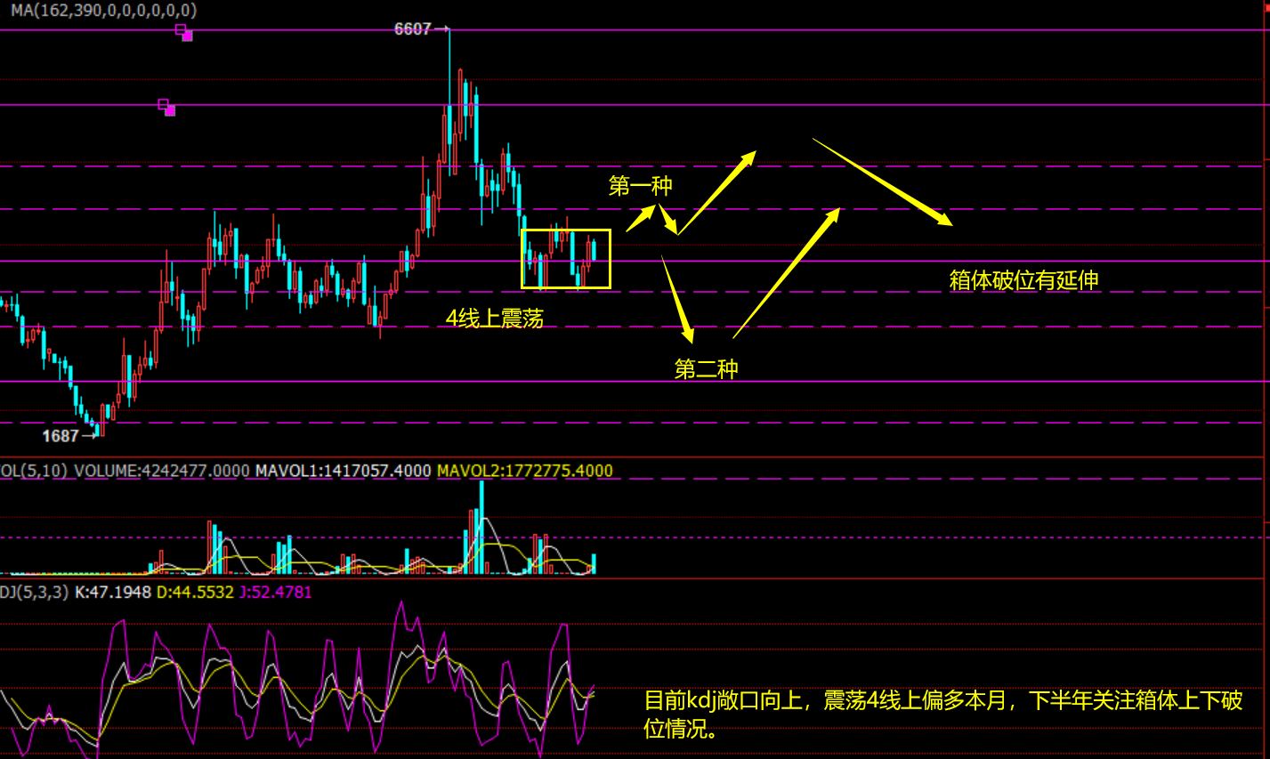 可以看到:目前其阴阳k线在一个大箱体3500---4300块钱直接震动,800块钱的空间会震动多久我们不知道,但是我们可以知道的是:突破箱体上下会有一定的延伸