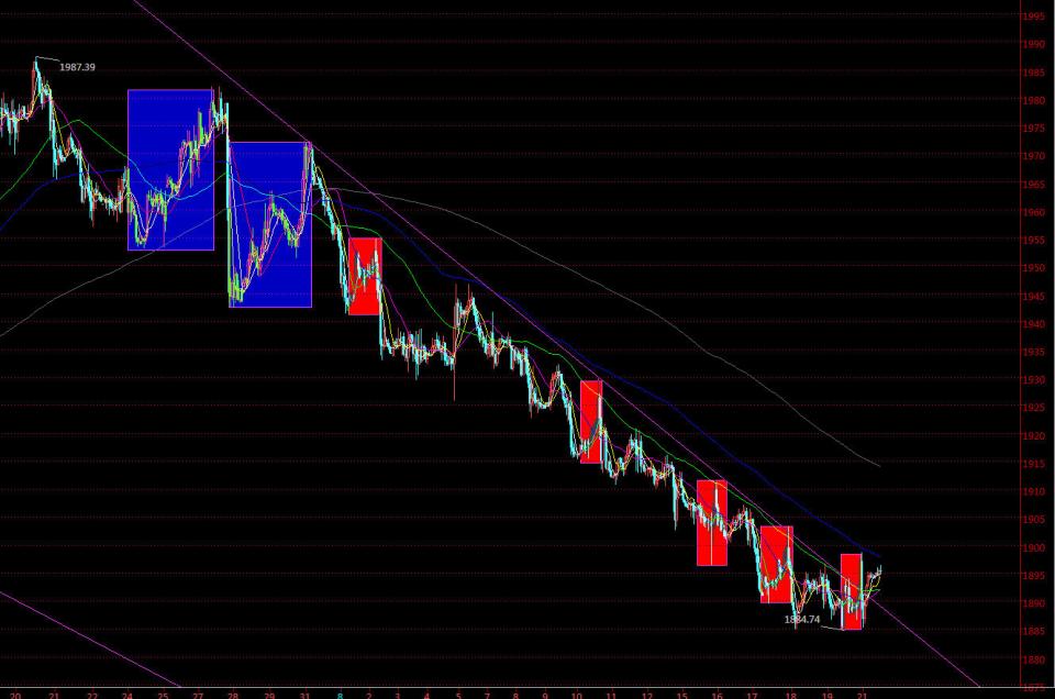 上周提到18T共振时间点,空间是1983.40-1892.80=90.6的幅度,即1987.40-90.6≈1896.8美元是个时空共振点。之后这个位置反弹了15美金到1911.50继续下跌,然后1889这个位置反弹15美金附近幅度我们1903/1904做了一次空头,但是,我们的观点基本都没有变,行情下跌基本都要随时要关注超跌反弹。本周周评提到以1884.50为风控做多,昨天1886-87多头涨到了1898.60美元。结果我们发现自低点上涨还是约15美金幅度行情又下跌,但是,最终还是守住了低点收了阳线,可以看出行情洗的非常厉害。