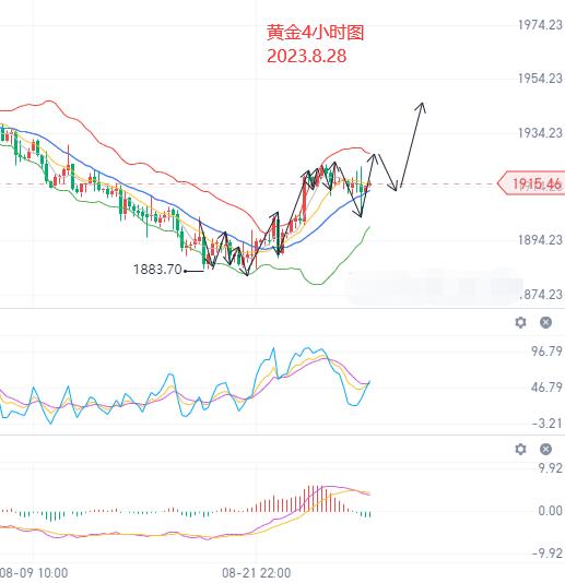技术面上来看上周五日线收了一根小阴柱,布林带开始缩口,继续关注突破布林带中轨突破情况,目前来看突破可能性较大,KDJ指标金叉放量,中线阶段性下行,大趋势仍偏上行。4小时图中来看布林带缩口,KDJ指标形成金叉,价格仍有上行需求。小时图中来看布林带开口,KDJ指标金叉放量,继续关注上行情况,下方支撑关注1901/1895/1883一线,上方压力关注1921/1930/1947一线.
