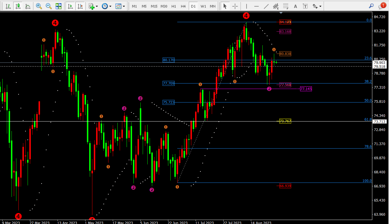 ① 日线收线十字星并且被中轨和抛物转向点压制在80.7-81一线,因此昨日的80.8很可能就是高点。而日线短期支撑在79.5附近,跌破将继续下行。日线指标macd死叉缩量震荡,灵动指标sto勾头向上代表短期的震荡。