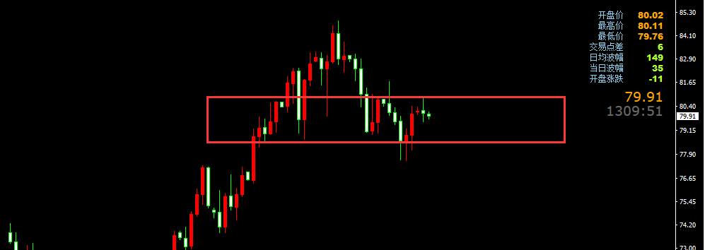 原油80.5附近继续空,防守81.3,看79下方,回踩78.2附近多,防守77.6,看80附近