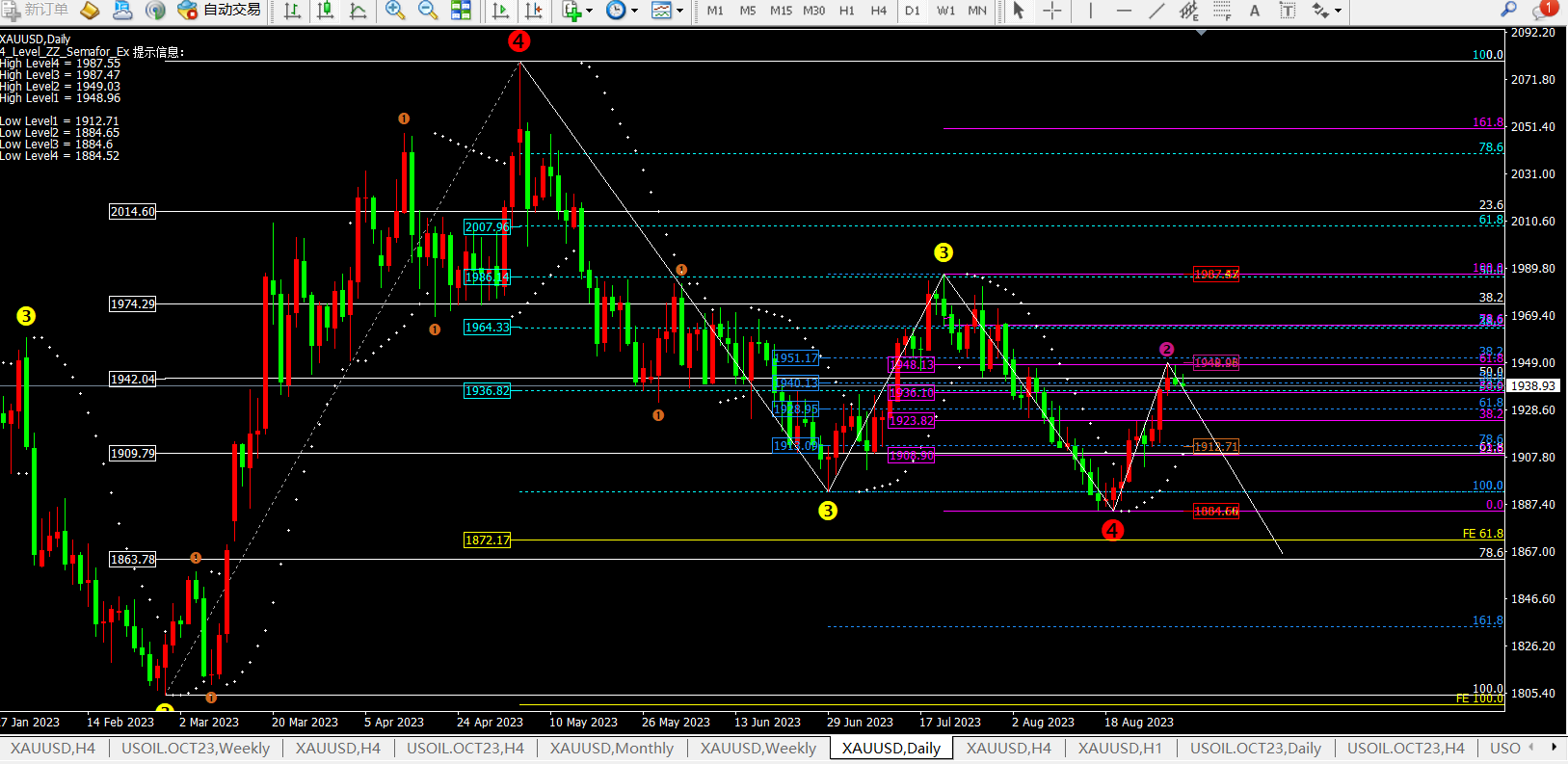 月线当前macd金叉放平震荡,灵动指标sto勾头向下修复,代表月线级别还是以震荡为主。根据月线的斐波拉契回调线看:当前震荡区间位于0.236-0.382区间对应1970-1902.