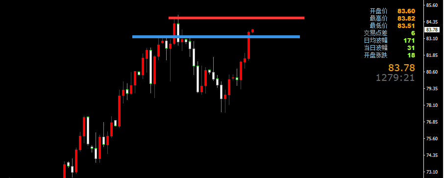 原油方面,随着美国战略原油库存的持续下降,补库存成了目前的当务之急,隔夜俄罗斯称会跟OPCE+一起实施更多策略来调控油价,言下之意就非常明显了,就是不想让美国买便宜的原油,多少要赚他一波,所以原油价格目前就易涨难跌,上个交易日早盘从81.5附近一路震荡反抽,欧美盘加速第一波触及83.2一线回踩82附近晚间二次拉高突破了83.5这个强压平台,短期就陷入了观望的阶段了,多看少动,等盘中实时信号了。