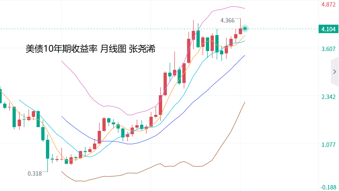 不过,整体来看,美元指数仍处于中轨上方,看涨趋势仍然存在,在未明显破位中轨支撑前,仍有继续看涨的前景,将会限制金价反弹动力。虽然美债10年期短期偏向回落走低,但日图回落动力减弱,或有回升迹象,月图仍处于较明显且长远的看涨,因而对于金价提振也将有限。金价近日后市偏向震荡或走低的概率仍然很大。