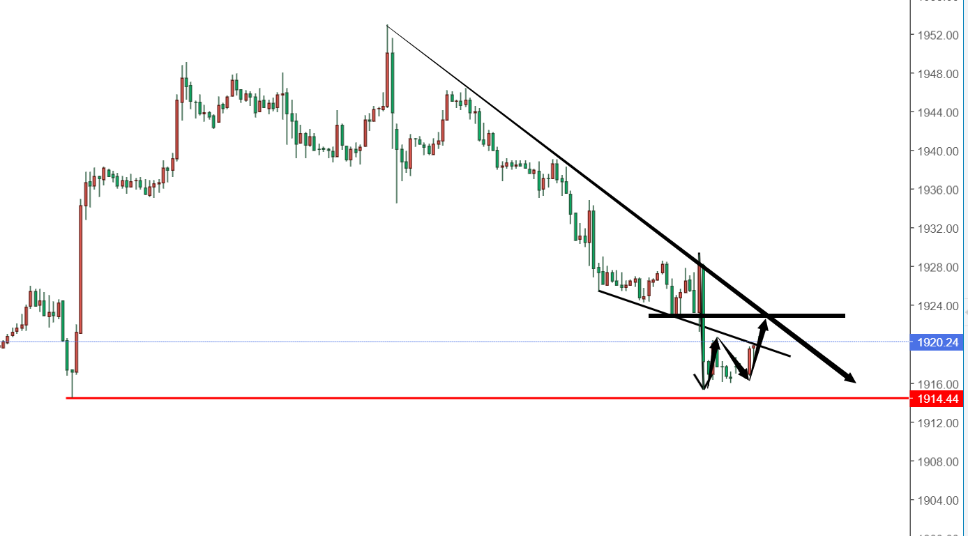 特别是昨晚的一波直线下跌,让图表又进入到了下一个空头阶段,而早上到现在,它只从底部反弹了5美金左右,这个节奏跟前几天有变化吗?没有,所以我直接在见到1918后就参与了,尽管我知道当前的价格是1920,但没关系,我依然会像昨天一样,给自己预留一定的加码空间,你要是想耐心等待,给一个说服自己的位置,那么1923是个不错的选择,因为它是这波下跌趋势线的一个预期压力位置,同时,它也是前天下跌的一个低点位置,你肯定乐意。