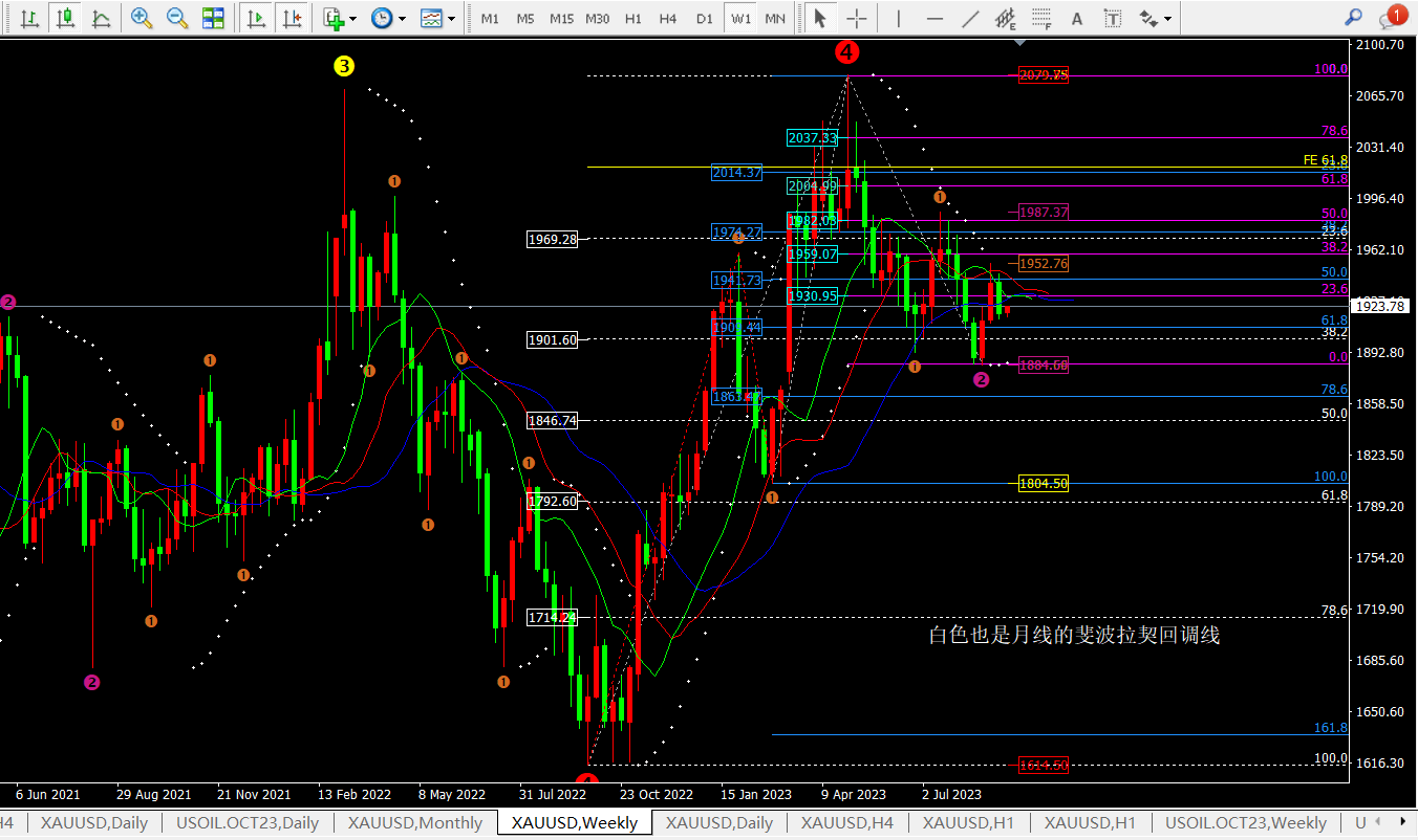 因此周线级别就出现了两个点位的空单:1928-29和1938-41两点。而多单就是均线MA5附近1916-17附近。
