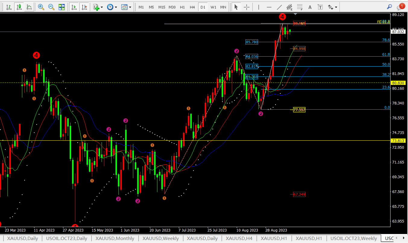 原油周线收线小阳柱,并且指标macd金叉放量,灵动指标sto向上修复;说明周线级别还是多头走势。而短期支撑在均线MA5和MA10附近对应84.1-2和81.8附近。