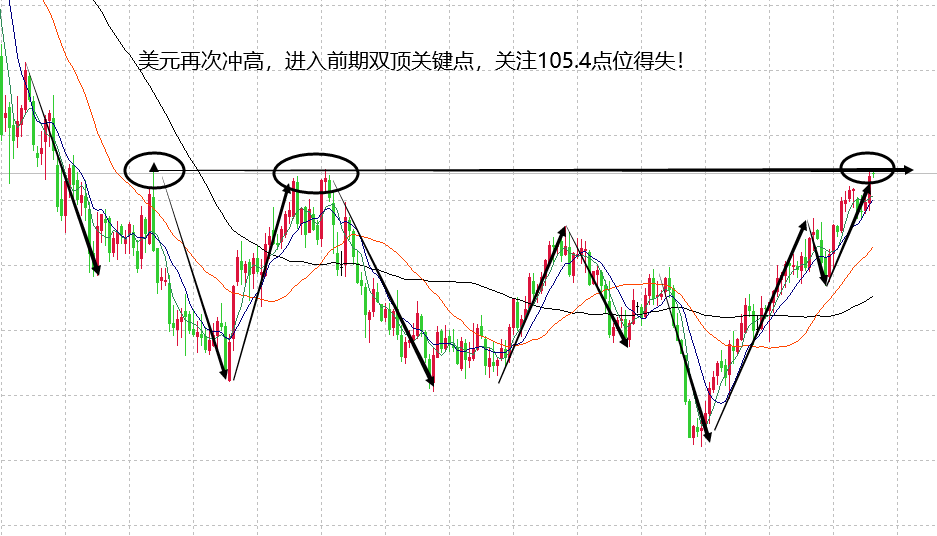 市场已经接近疯狂,美元,黄金,原油齐涨。周四美元在数据影响下继续走高,美盘市场环境也给美元带来一定的多头动能,刺激美元继续走高,目前又到105.4高点。前面讲过,美元这波多头会在105.4附近压制走出回落空间,实际在上周触及105.2附近走出了回落,但有效力度没有跌破104.2,所以,整体还是一个强势震荡状态,近期再次走出上涨也理所当然,至于现在价位能不能破位105.4,可以肯定的回答,目前市场环境是可以出现再次大涨的空间。大家要注意对黄金的影响和货币对的影响。