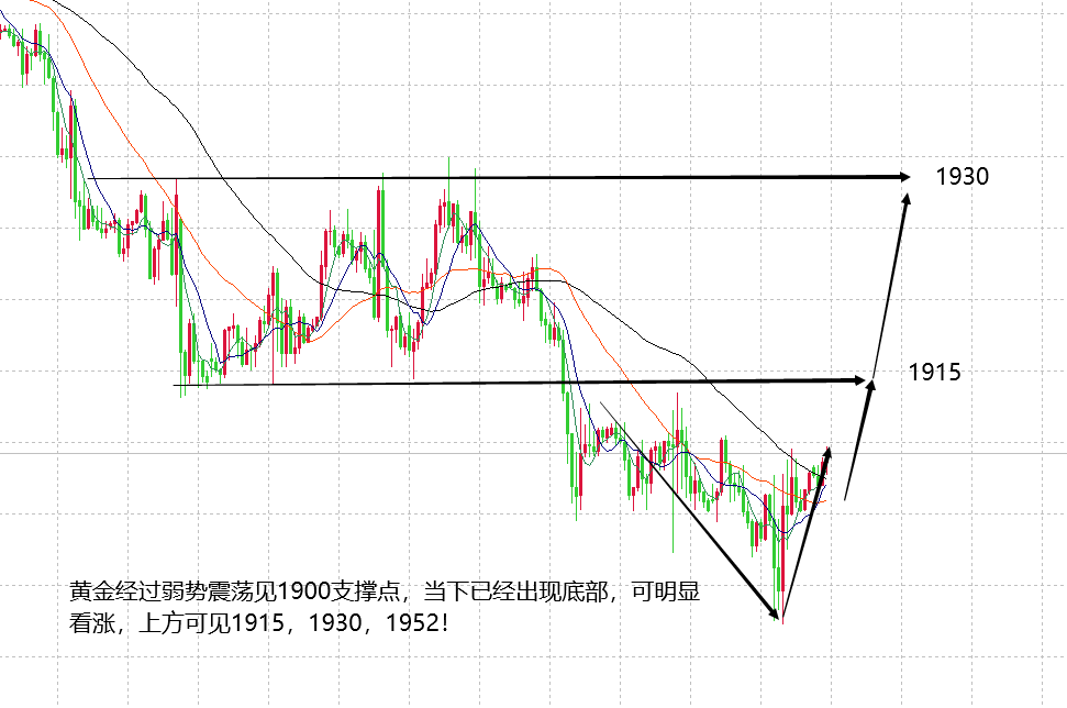 开篇先强调黄金当下核心思路:黄金震荡弱势走完,低位见底,近期持续看涨至1950高点!首先说一下周四见底的状态的效果。周四在数据利空后,黄金微跌至1900,经过几次低位试探,黄金成功站稳在1900之上,虽然周四午夜反弹力度不大,最高也就1911,但至少日线已经在低位收阳了,终结了本周弱势慢跌的连阴形态,而且日线周期布林收口,上方可以逐步看到布林上轨高点1950,所以,近期黄金明确思路,坚持看涨即可。周期性交易注意,虽然现在明确看涨,但前期1915的压制点都没有破位,因此,暂时也并非是绝对的强势,只是一个震荡,慢涨的状态,所以,看涨做多也需要在关键点位操作,等回落做多。H4周期低位三连阳,早盘的上涨直接破位布林中轨压制点,之前压制变支撑,日内看涨就要稍微激进点,下方支撑点在1910附近,等待回落做多就放在1910,上方可见H4布林上轨高点或者60日均线高点1922附近,如果能意外大涨,就见1930高点。周五慢涨走出来,日线连阳,那么,下周更加确信近期黄金能上涨至1950高点。近期大家要注意,尽量顺势做多,不留空。