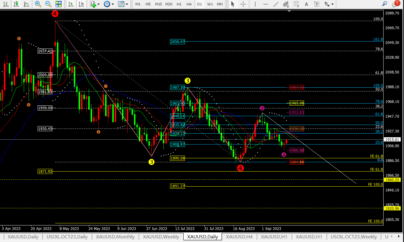 当前根据日线的斐波拉契回调线看:上方压制在0.382位置1924一线,支撑0.236位置1909一线。