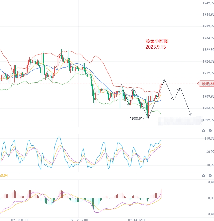 技术面上来看日线昨日收了一根小阳柱,布林带即将缩口,价格即将选择新的方向,KDJ指标即将形成金叉,MACD指标绿色能量柱较弱,大趋势震荡偏弱,中线阶段性下行。4小时图中来看布林带即将缩口,价格即将选择性的方向,KDJ指标金叉放量,短线维持反弹修正。小时图中来看布林带大开口,KDJ指标金叉放量,但目前短线价格运行于布林带上柜上方,今日预计依旧小幅反弹修正后下行为主。日内下方支撑关注1908/1900/1883一线,上方压力关注1928/1935/1952一线.