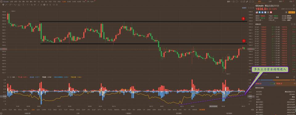 通过对黄金小时图解析得知,昨日行情先跌后涨,在下方1901一线止跌反弹目前已经接近上方1号压力位,我们从下方的附图可以清楚的看到,近期三个交易日多头主力资金持续不断地介入从而导致行情的反弹,但是短期资金依然是在弱势区运行,短期大方向下跌不变,一旦盘中放量突破并且站稳1号位保持三天以上后期行情将会进一步加速拉升,短期在操作上我们继续高空低多思路,具体建议参考早盘策略