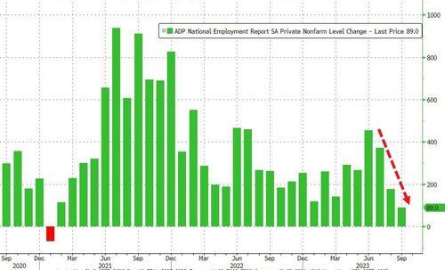 10月4日周三,有“小非农”之称的美国ADP就业报告显示,9月美国私营部门就业人数经季节性调整后仅增加了8.9万人,为2021年初以来最少,大幅不及预期的15万人,前值从17.7万人上修至18万。数据非常的差,算是给近期爆表的美国经济数据降了降温。