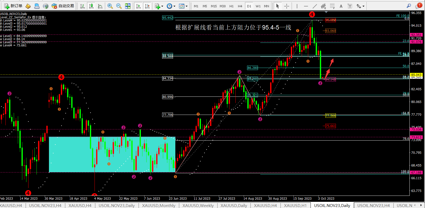 4小时当前macd死叉二次放量,灵动指标sto也向下进入超卖区域,短期关注4小时均线MA5的压制对应84.86一线,其次是均线MA10附近87一线。从4小时看目前非常明显价格跌破前期低点87.7-8后惯性下跌并没有任何反弹,所以该位置是本周的支撑阻力转换点。