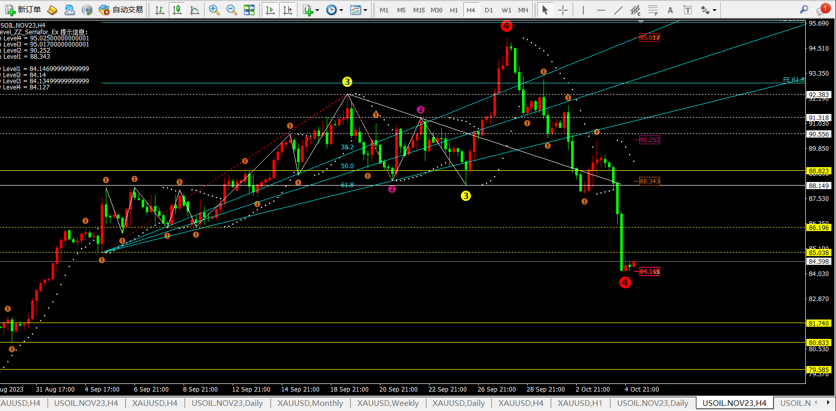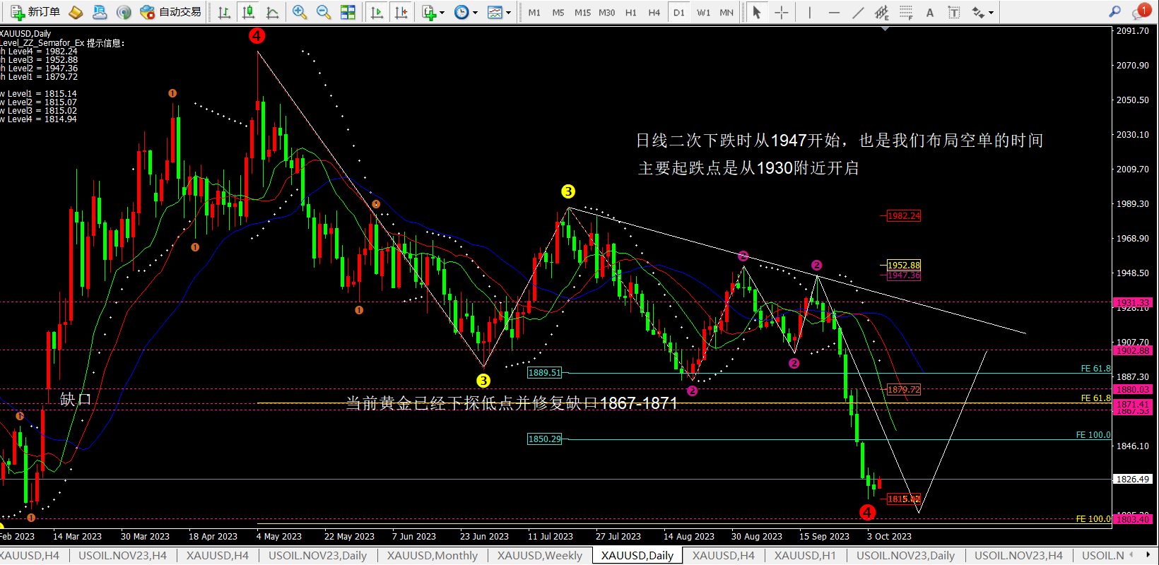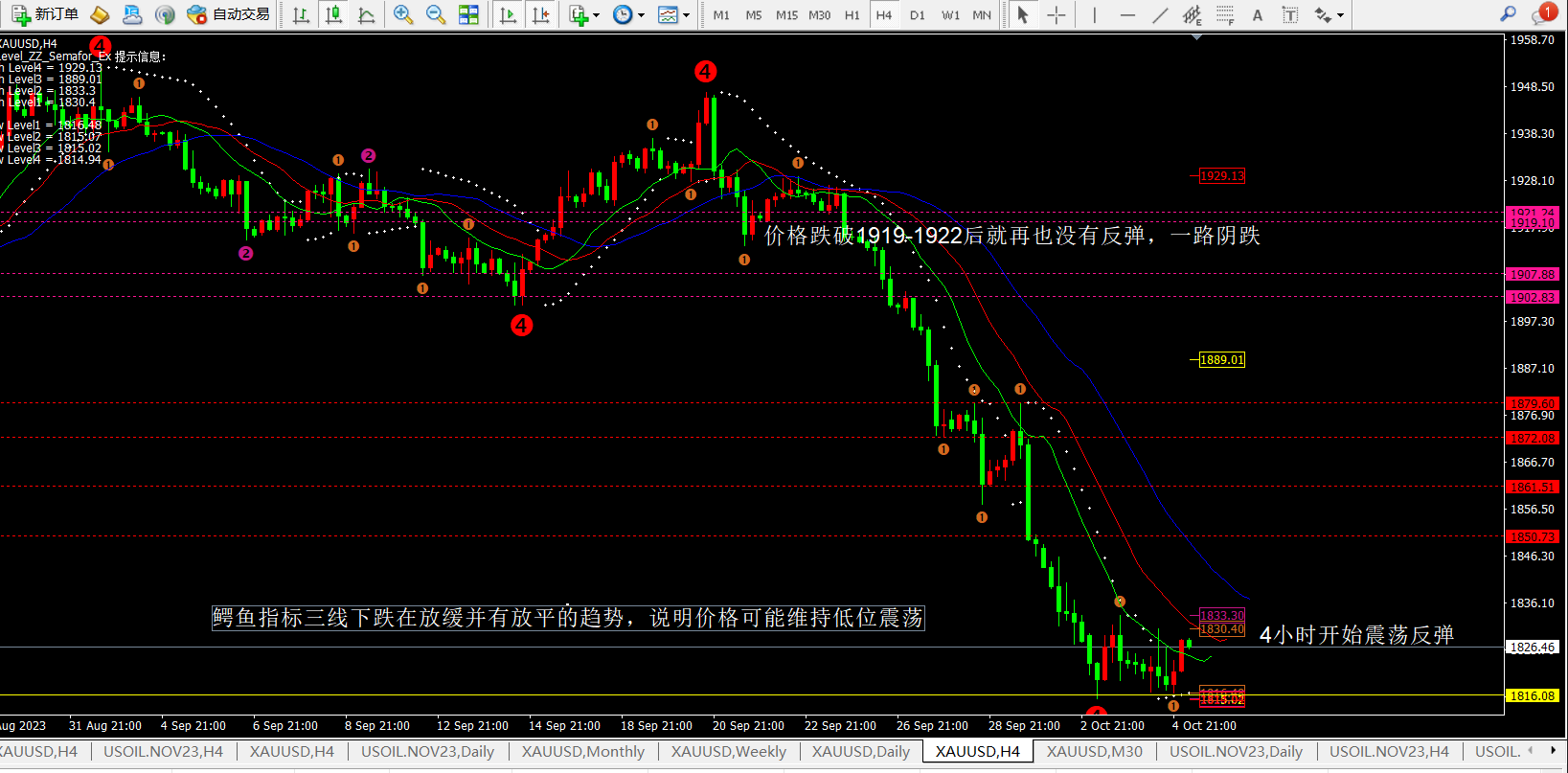 任天成:10.5黄金4H开始触底等待明日反攻 原油将持续走弱