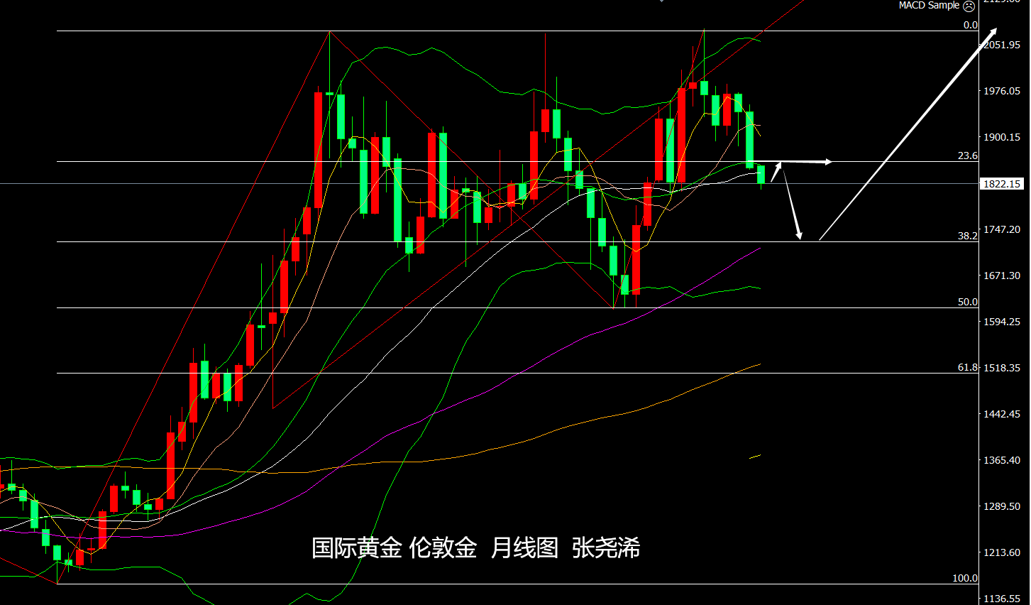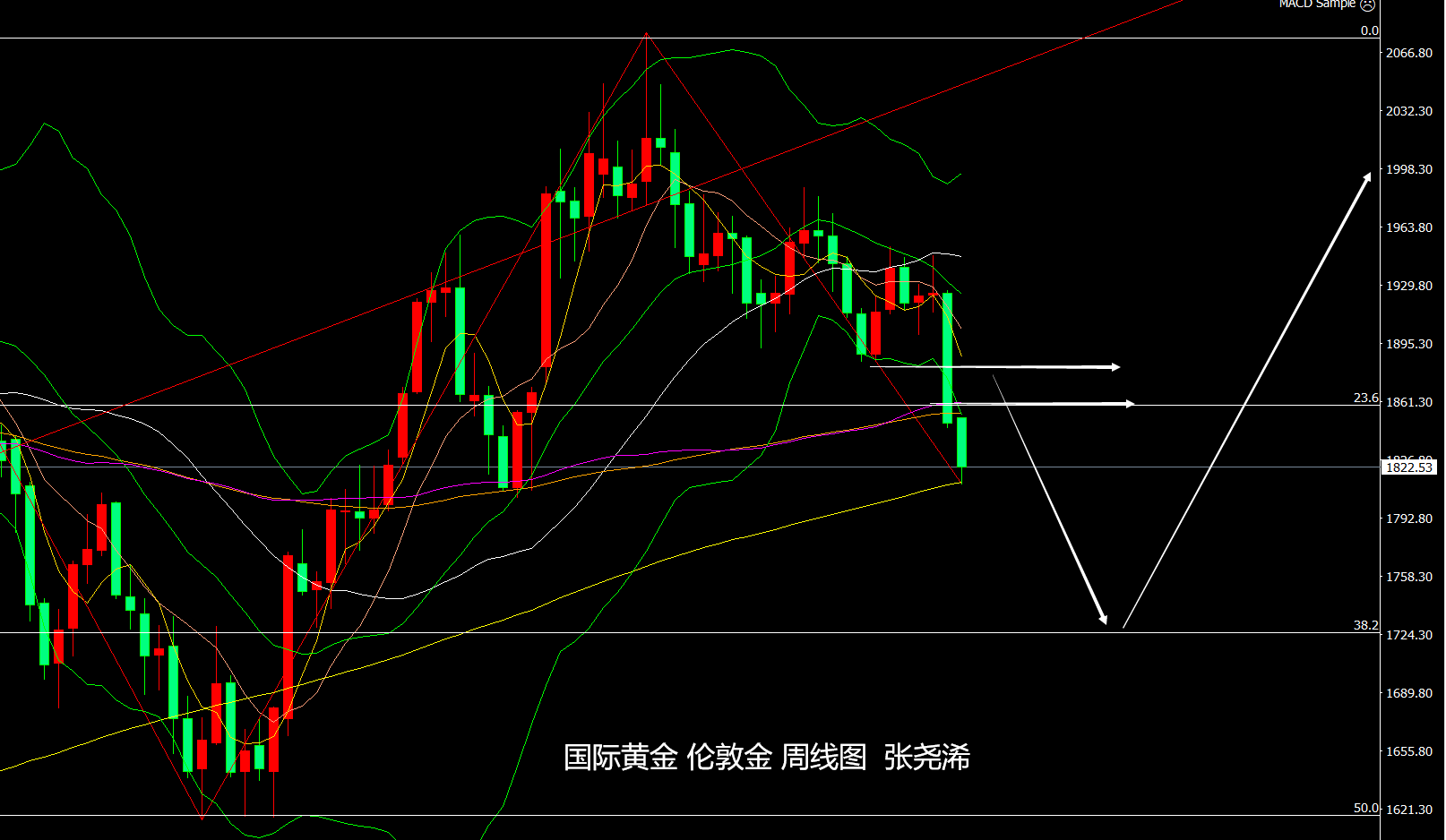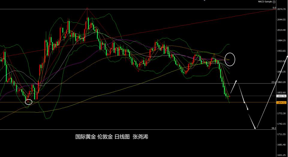 所以,对于金价来说,目前的震荡筑底,就算有回升反弹行情,上方100周均线阻力,或者是日图23.6%回撤线的1860美元附近,也都是可再度看跌回落的位置。