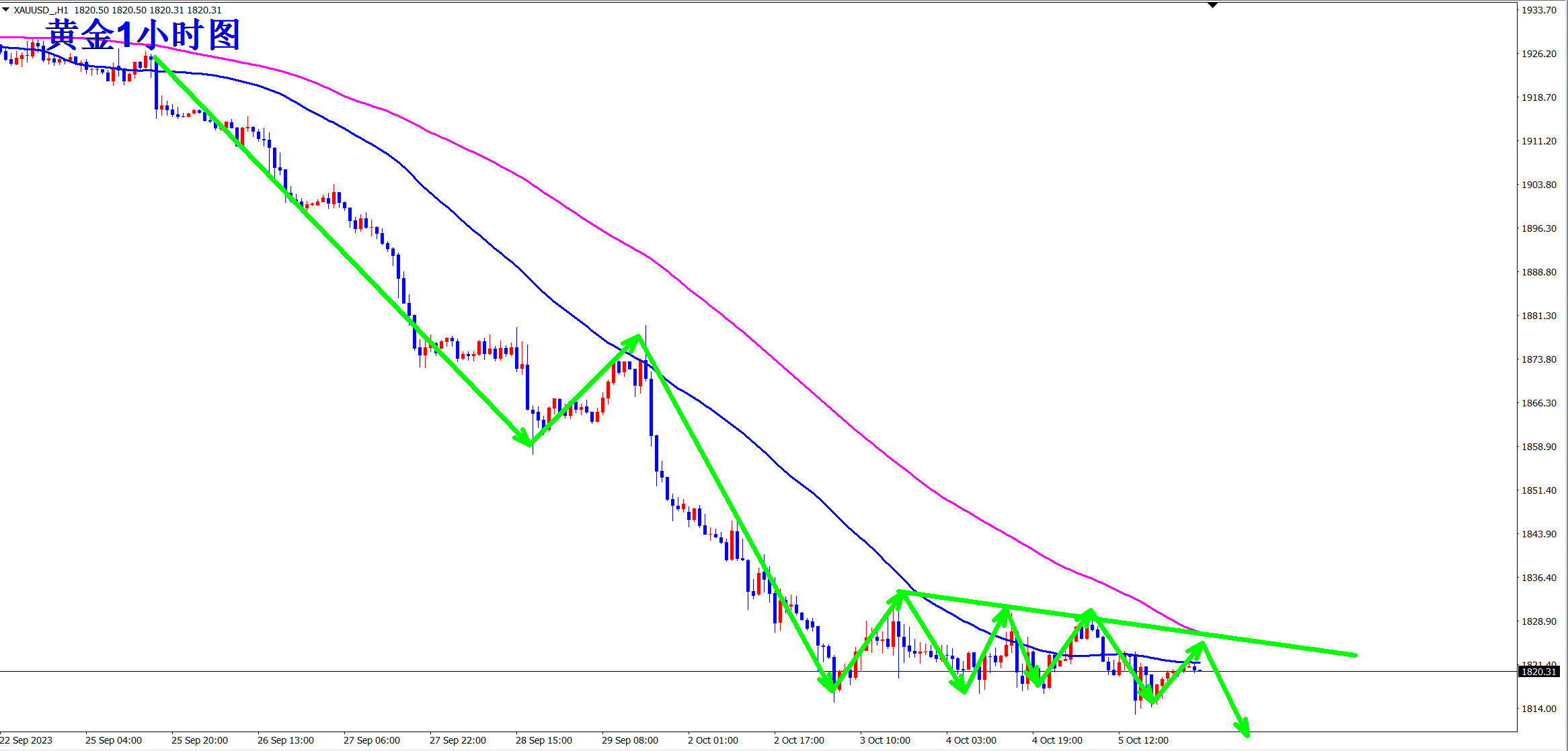 当前黄金跌势继续,依旧受到均线的压制,没有突破均线压力,并且没有回踩确认前!我们继续的高空!当前黄金反弹高点形成的连线和均线的双重压制,就是我们再次干空的位置!