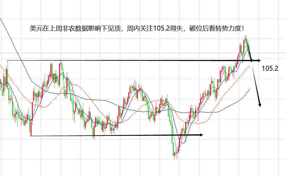 上周在非农数据之前,美元冲高至107后见顶,虽然非农数据大幅利好没美元,但实际美元并没有走出大涨空间,还是保持在107高点之下,在当下地缘局势影响下,美元周一开盘再次走低,目前下跌至105.9附近,按照目前黄金,美元只要保持在105.2之上还是处于强势震荡,加上市场等待本周CPI数据和美联储会议纪要等因素影响,美元在本周可能有较大波动,跌破105.2可见多空趋势转换,不破105.2在多头趋势之下,还有上涨的可能。因此,注意本周美元可能变盘。