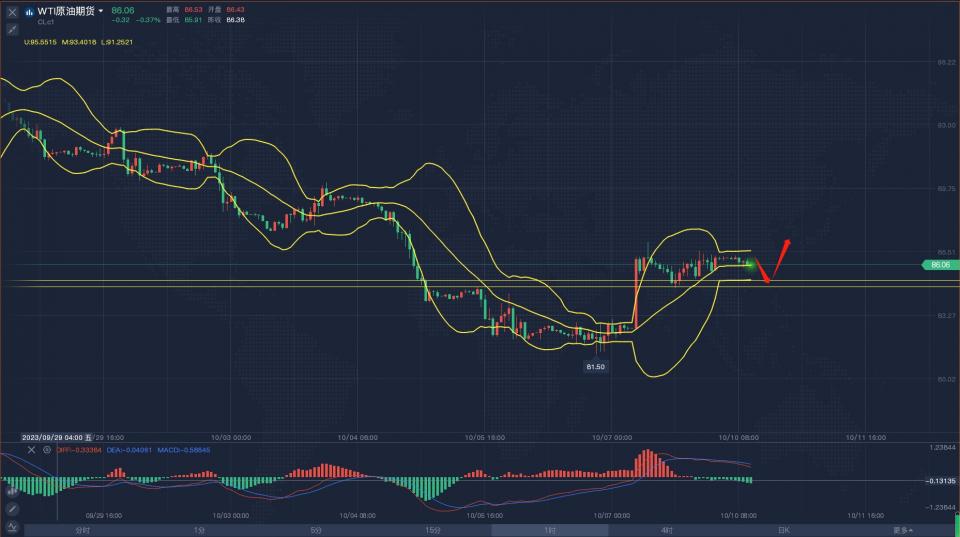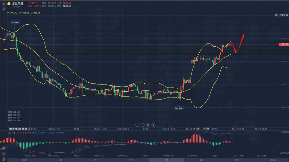从日线上来看,布林带收口,价格在下轨附近企稳之后开始了持续性的反弹,早间开盘价格延续上涨走势,并走出新的高点,价格整体受战局影响因素较大,短线来看,下一个目标就是1880附近。4小时,布林带开口向上,周一的跳空使得价格直接站上上轨,在经历了一天的盘整之后,昨晚形成了向上的破位,整体走势震荡偏多,日内短线则需要关注昨日破位的位置,也就是1855-1857这一区域的支撑,耐心等待价格回调企稳之后即可布局多单。