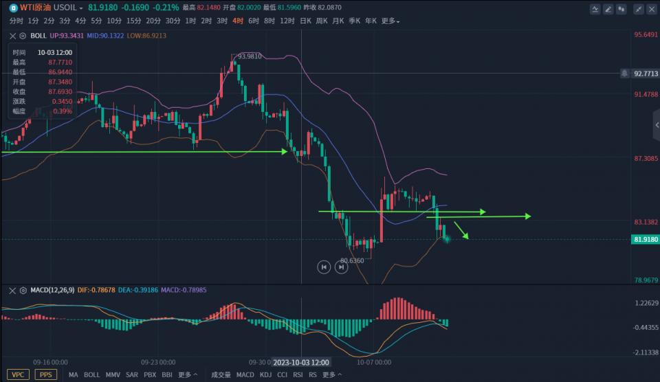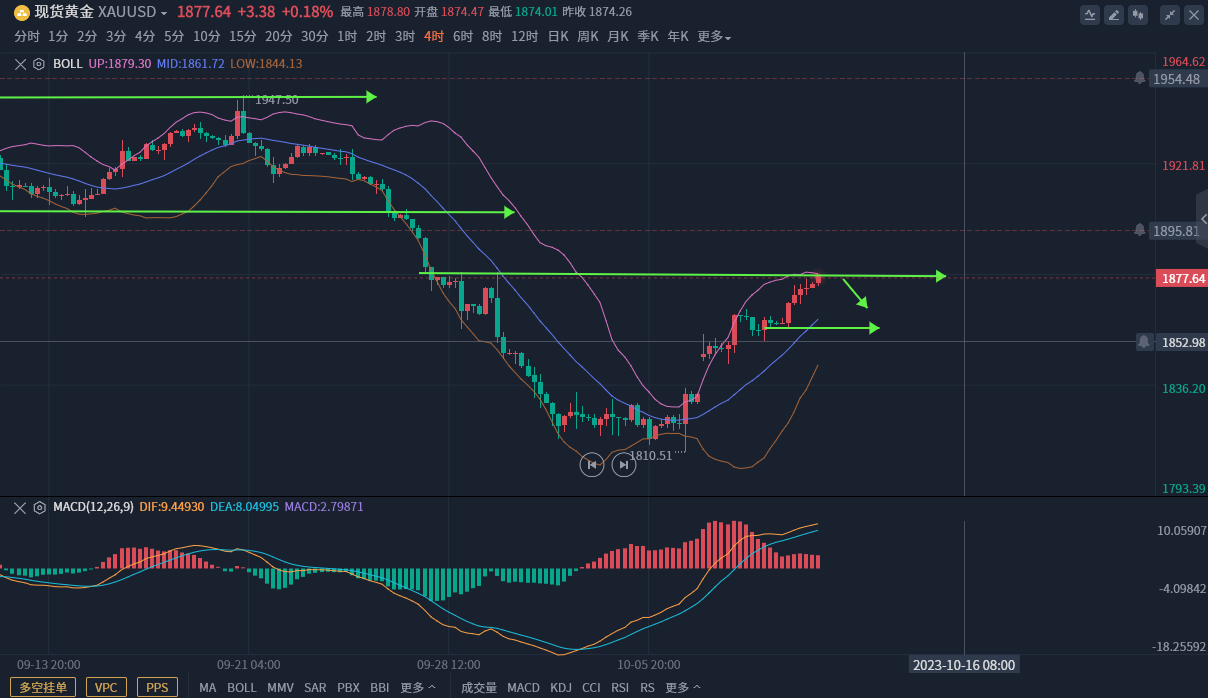 黄金方面、10月初黄金围绕1830下方低位盘整,长时间弱势盘整不破低,而且四小时指标破低价格不破低出现背离,那么反抽调整势在必行,特别上周五公布非农数据,实际公布非农业就业人口增加33.6万人,远高于前值18.7和预期17万人,黄金逆势上升大阳收盘更坚定看涨调整信心,操作思路就是一路多。周末爆发巴以冲突,周一早盘直接大幅跳空上升,避险刺激只是黄金上升催化剂,实际还是技术性反抽调整。
